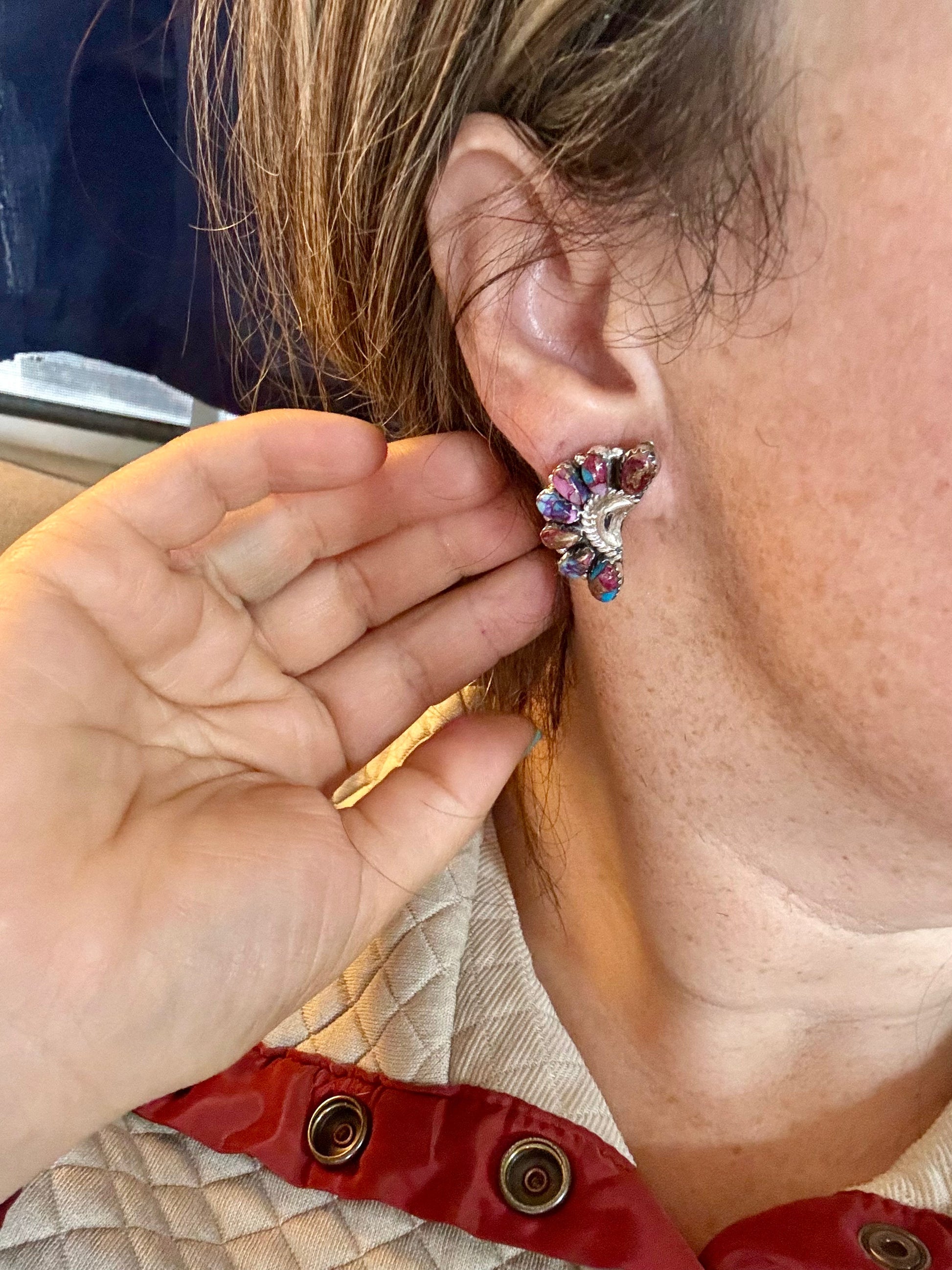 These handcrafted half cluster earrings feature vibrant pink dahlia set in solid sterling silver. Stamped JW (see photo) and made in the USA, each pair is truly unique—full of rich color and classic western charm.